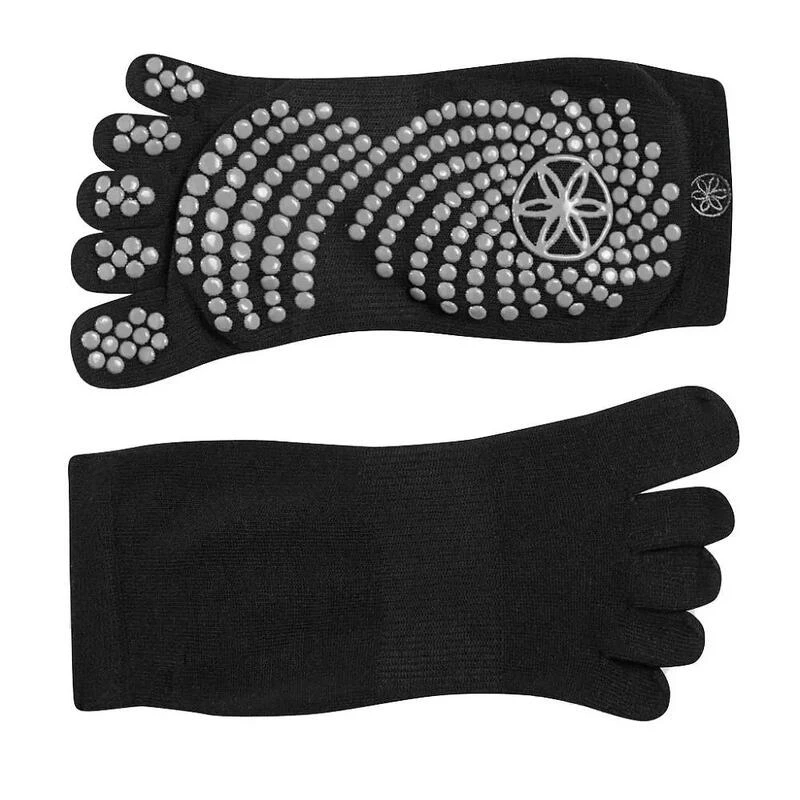 Met de Gaiam Grippy yogasokken is uitglijden tijdens je yogasokken verleden tijd. Deze classic yogasokken zijn voorzien van een anti-slip grip op elk oppervlak van de sok je evenwicht en stabiliteit te vergroten. Deze comfortabele Grippy yogasokken zijn ontworpen om zowel met als zonder yogamat te gebruiken. Omdat alle tenen in deze teensokken apart kunnen bewegen, kun je een optimale grip behouden. Ook wanneer je dus op reis bent, kun je deze yogasokken eenvoudig meenemen en overal yoga beofenen. De maat van deze yogasokken is M/L en daarmee is dit paar sokken iets groter dan de gebruikelijke maat yogasokken. Hierdoor zijn deze yogasokken geschikt voor yogabeoefenaars met grotere voeten dan gemiddeld. Specificaties Kleur: Zwart, met grijze grip Aantal stuks: 1 paar Maat: M/L Materialen: 95% polyester, 3% rubber, 2% spandex Wasinstructie: Wasmachinebestendig, niet in de droger.