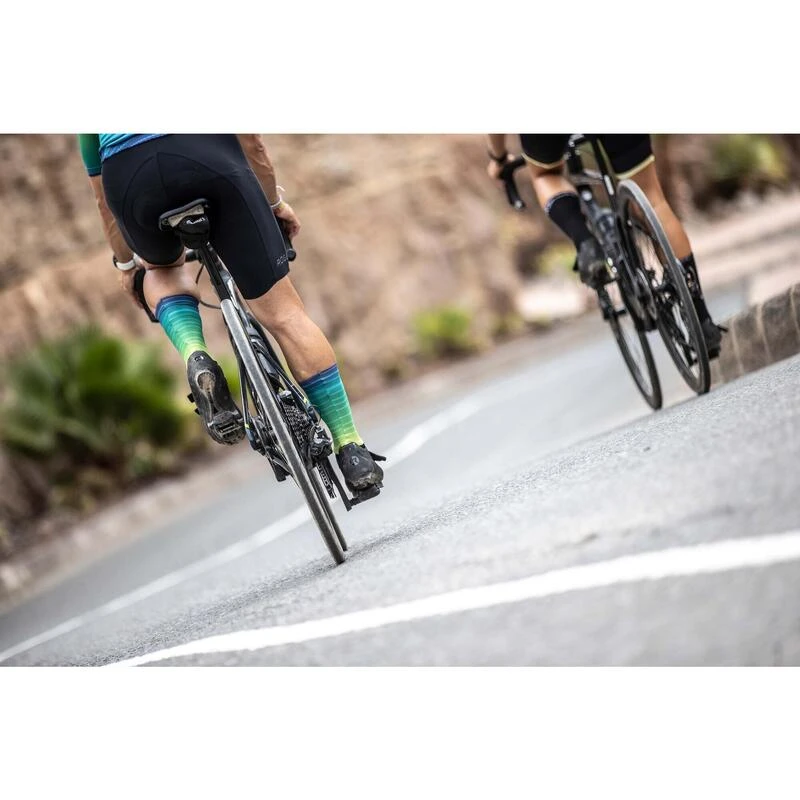 De Surf sokken zijn onderdeel van de Rogelli Surf set en passen perfect bij het Surf fietsshirt. De sokken zijn gemaakt van een combinatie van een ademende Mesh stof en een high performance Coolmax stof, die speciaal is ontwikkeld om transpiratie af te voeren. De Surf sokken met elastische en aerodynamische pasvorm zijn high cut en hebben naadloze tenen.